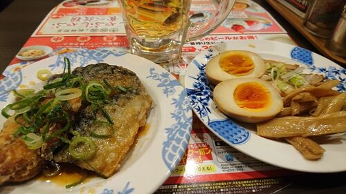 生ビール ハイボール おつまみ3種盛り サバ唐揚げ甘酢しょうゆ 焼豚エッグチャーハン(スープバー付き)水餃子四川胡麻ソース(6個)セット計¥2050バーミヤンでは平日の午後6時まではハッピーアワーで、生ビールなどが¥200!おつまみ小皿メニューも2種類頼む…
