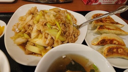 ネギ肉炒め定食(ごはん・スープ・漬け物付き) 餃子セット¥940京成船橋駅の下の商業施設にある、中華料理のたぶんチェーン店。テーブル席が多くて、カウンター席は5席くらいかな。外から丸見えだし、ひとりでも入りやすいかと思う。定食メニューで、まだ頼…