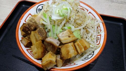 肉ふじ¥880イオンモール幕張新都心店のフードコートにあるお店。 他にも出店しているみたいだけど、似た名前のお店も多くて、よくわかりません。期間限定と書かれたメニューにしてみた。ここはフジヤマっていう、その名の通り富士山のように盛られたラーメン…
