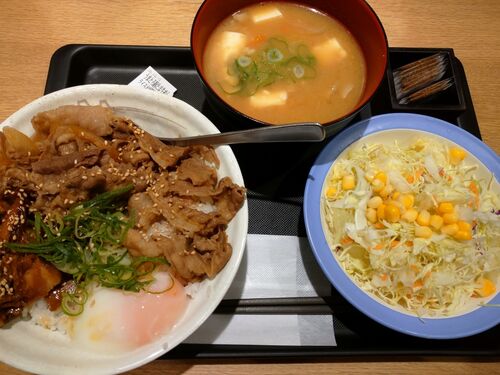 うまとろ豚たま牛めし豚汁生野菜セット ¥840昨日から販売開始の数量限定メニュー。55万食限定とのこと。前にもこういうメニューはあったような気もするけど?いつもの牛めしに、とろとろになるまで煮込まれた豚肉と半熟玉子がいっしょに盛られている。豚肉は…