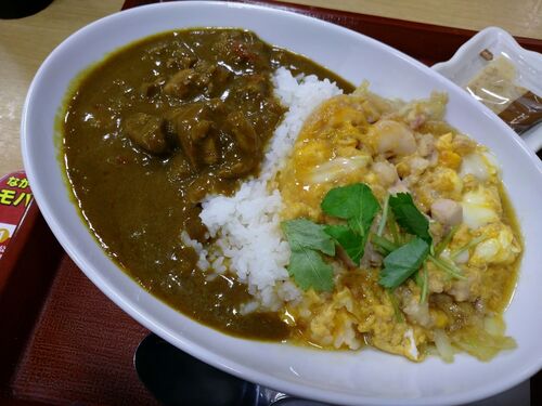 親子カレー(並盛) ¥680サラダ ¥150計¥830 先週から販売開始の新メニュー。最近のなか卯は合い盛りの新メニューをよく出してるような。こちらもそのひとつ。親子丼とチキンカレーを同じ皿に盛っただけではあるのだが、見た目はかなりボリュームありそう。で…