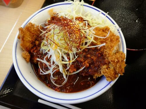 辛出汁チキンカツ丼 ¥649とん汁(大) ¥176計¥825 今日から販売開始の期間限定メニュー。かつてあった「赤辛カツ丼」の進化系メニューとのことだが、そんなメニューがあった記憶がない…。 《見た目に伝わる真っ赤なタレに、鶏ひき肉とにぼし粉を加えた辛い中…