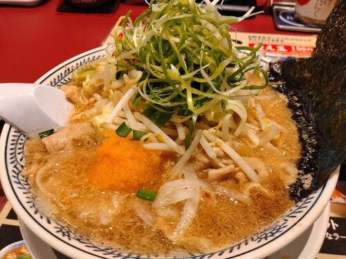 野菜肉そば ¥913 温玉ごはん ¥220 計¥1133 今年の6月に船橋競馬場駅前にオープンしたお店。 前回は看板メニューの「熟成醤油ラーメン 肉そば」にしたので、今回はそれに野菜をトッピングしたやつにしてみた。 ネギが山盛りで、その下にはモヤシやキャベツも…