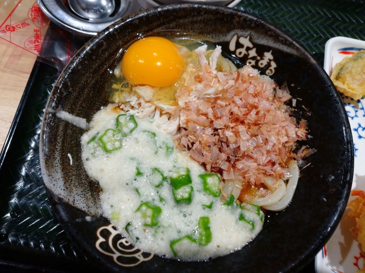 とろろにはオクラが入っていて、あとは蒸し鶏、味つけには練り梅が。