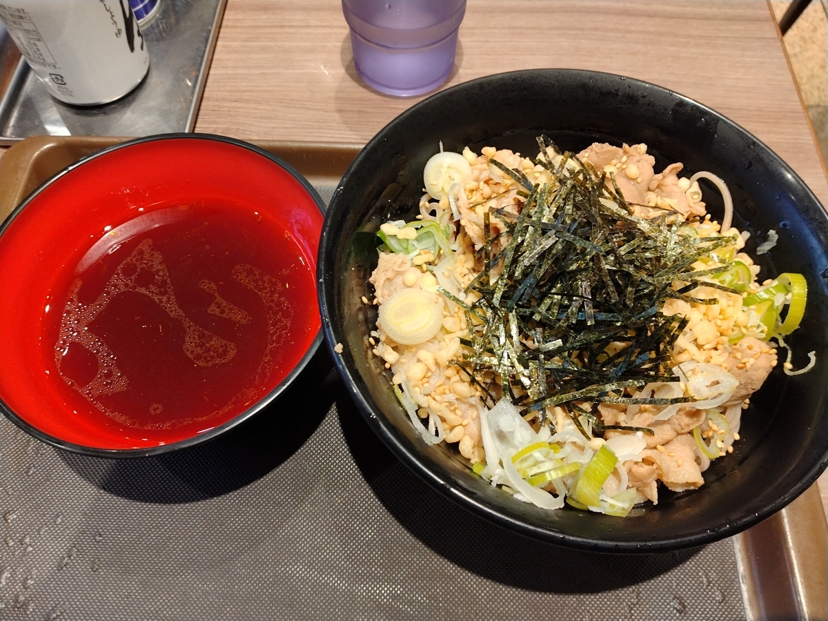 冷たいそばの上には、豚肉、海苔、揚げ玉、ネギ。
